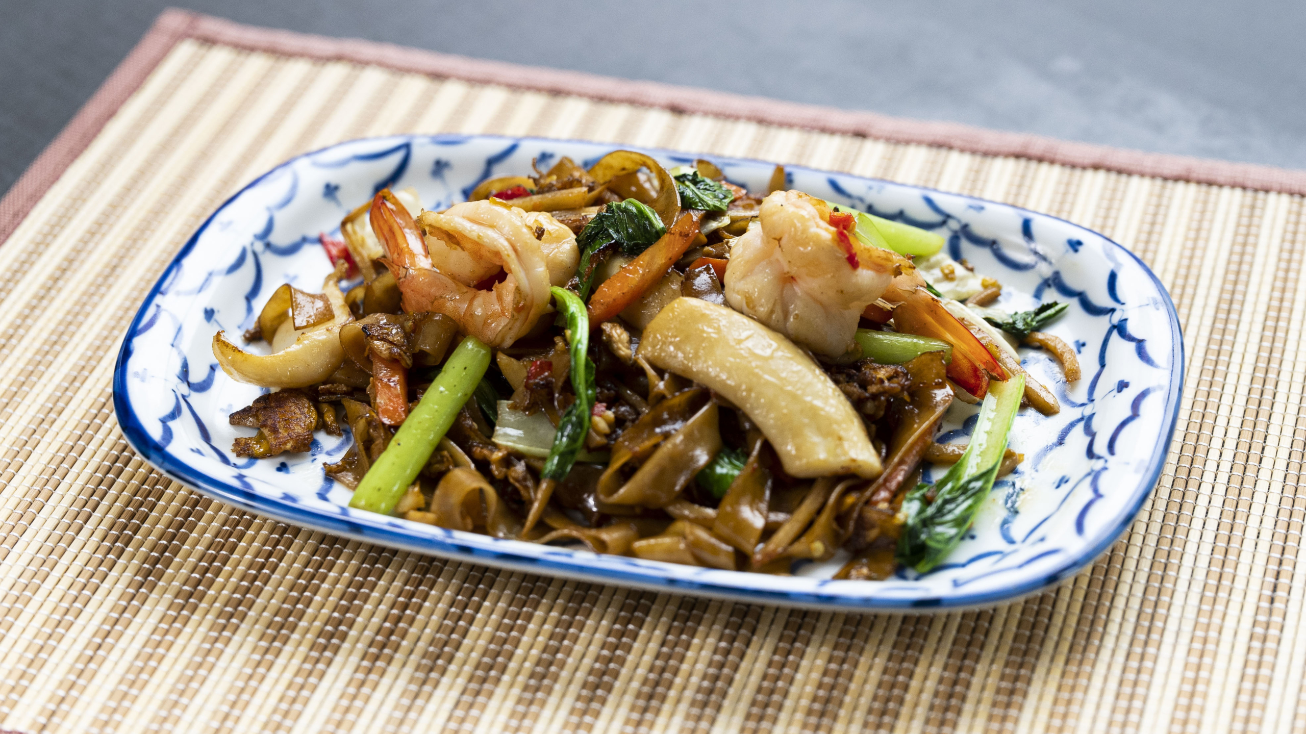 タイ料理『パッキーマオ』は酔っ払いが食べたら元気になる料理として知られる代表的なスタミナ満点の料理です。 幅広のお米の麺とエビ・イカと野菜をたっぷり使い炒めた焼きそばは人気メニューです。