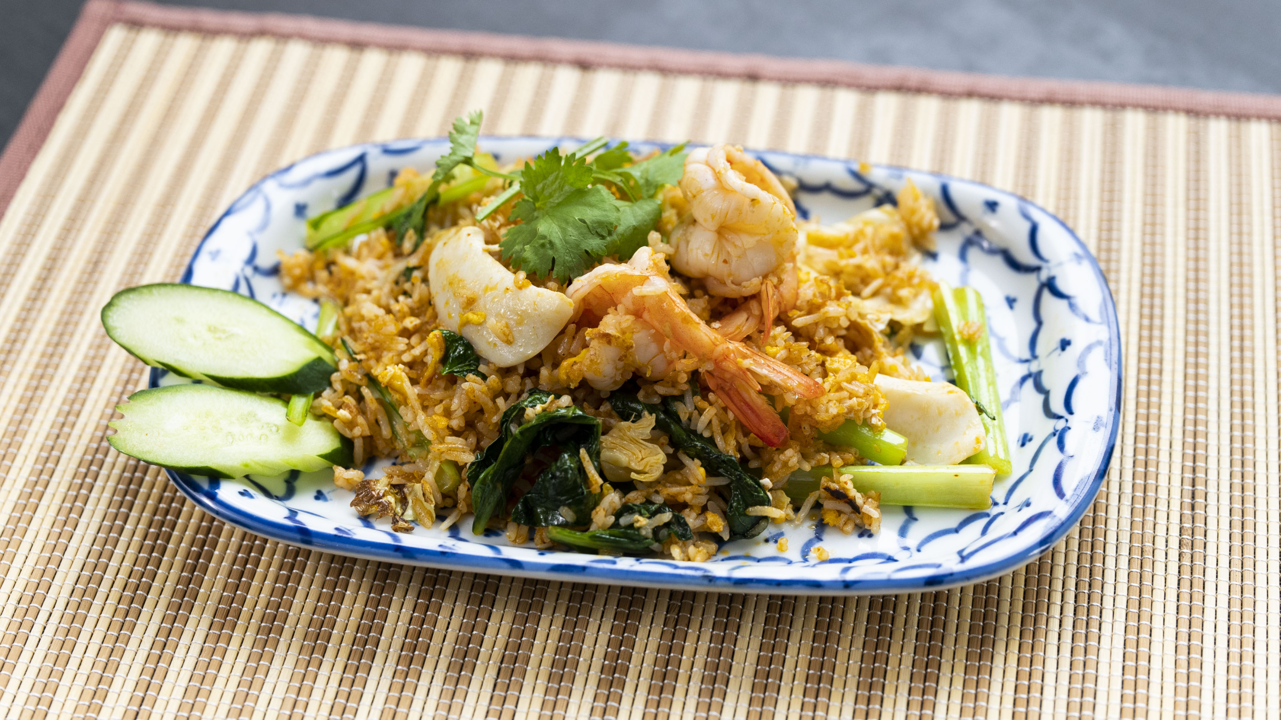 トムヤム炒飯は代表的なタイ料理でカオパットトムヤムと呼ばれるトムヤンクンで 味付けした炒飯です。タイのお米ジャスミン米とエビ・イカ・野菜をパラっと炒めた 酸味と辛さを味わえるタイ料理です。